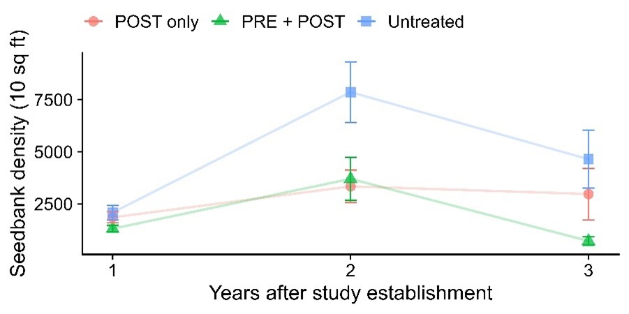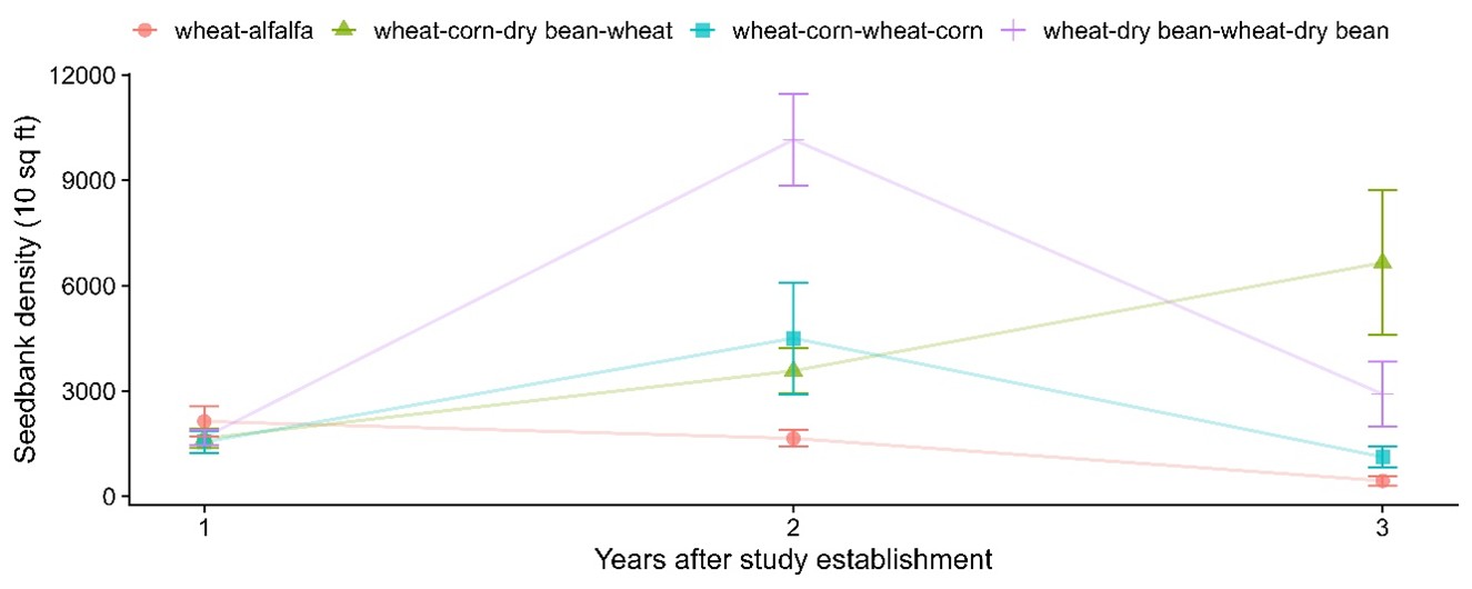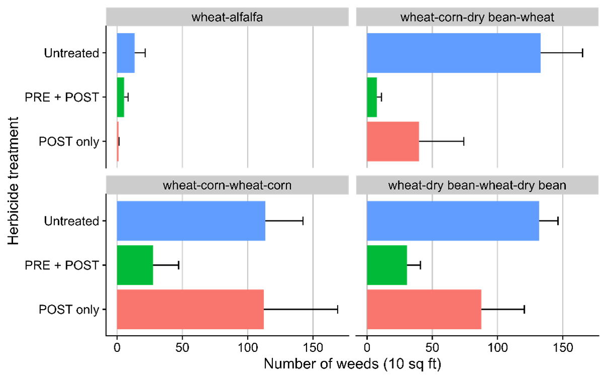 Most of what we found was expected but there were a few fascinating results! Although weed seedbank density tended to be higher in the nontreated checks (which we expected), there was a trend of preemergence + postemergence treatments reducing weed seedbank density compared to postemergence-only treatment (Figures 2 & 4). Including alfalfa in the crop rotation significantly reduced weed seedbank density, irrespective of the herbicide treatment (Figure 3). On the contrary, dry bean in the rotation significantly increased weed seedbank density (Figures 2 & 3). Weed density within the crops during the growing season was influenced by the type of crop as well as the herbicide treatment. Both the postemergence-only and preemergence + postemergence treatments reduced weed density compared to the nontreated and the preemergence + postemergence treatments reduced weed density in nearly all the crop rotations compared to the postemergence-only treatment. We strongly believe that the combination of fewer weeds and greater crop yields in the preemergence + postemergence treatments holds promise for reducing weed seedbank and potentially improving crop productivity and economics. Also, if the intent is to deplete the weed seedbank of problematic weeds, including alfalfa in the crop rotation is more effective than intensive annual crop rotation.