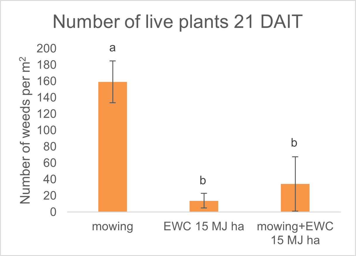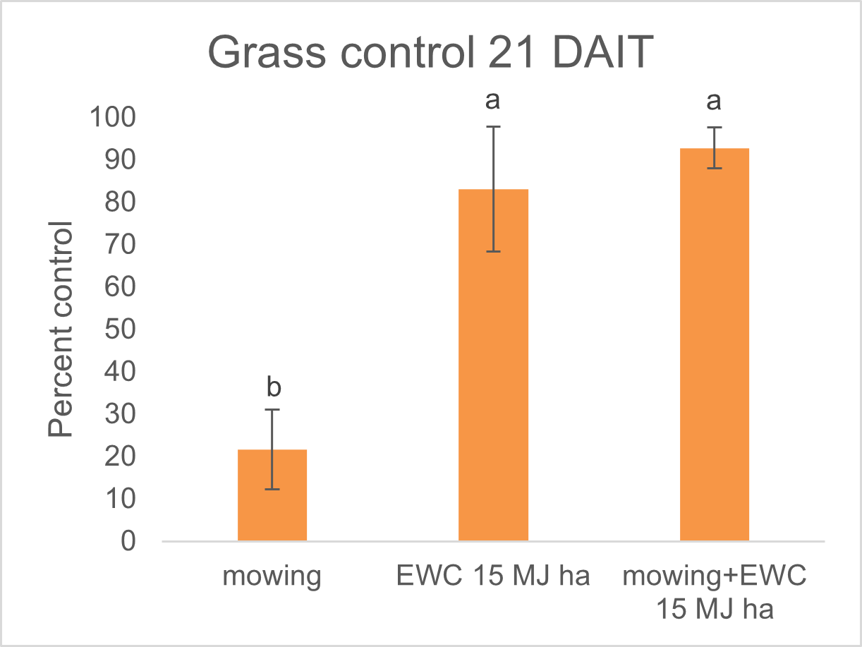 The mowing + EWC also showed good control; however, when applying the EWC after mowing there is dry plant biomass on the soil surface and there is greater chance of the dry biomass catching fire, especially if it is a windy day (Figure 3).