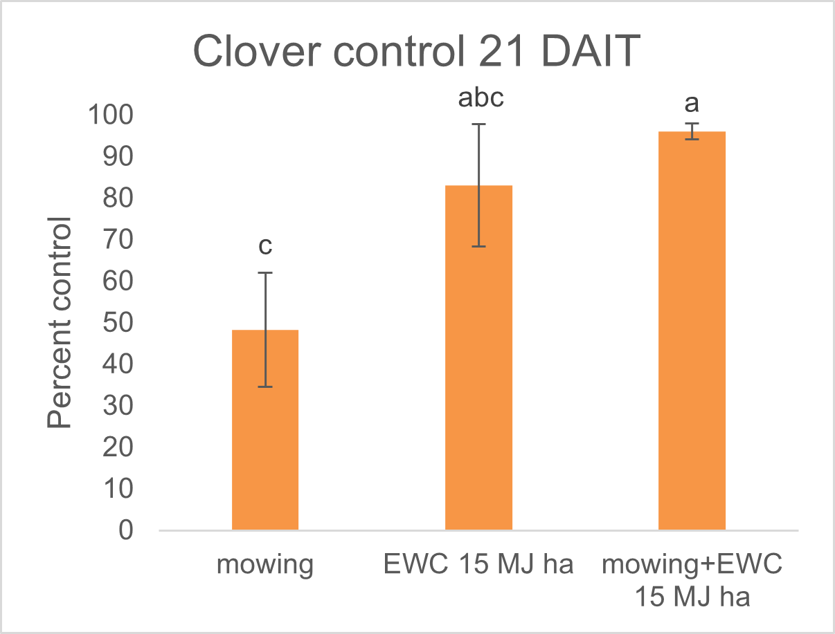 Figure 2. Results of cover crop termination with mowing, EWC, and mowing + EWC before soil preparation at 21 days after initial treatment (DAIT). Standard error is presented on error bars and means were subjected to Tukey’s HSD α=0.05.