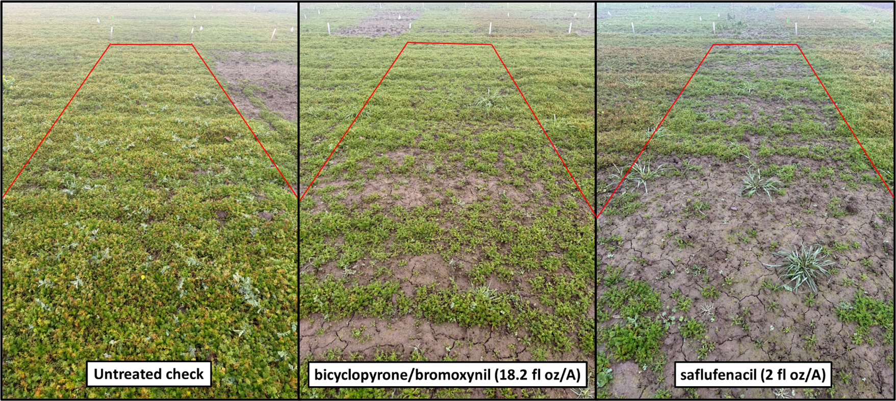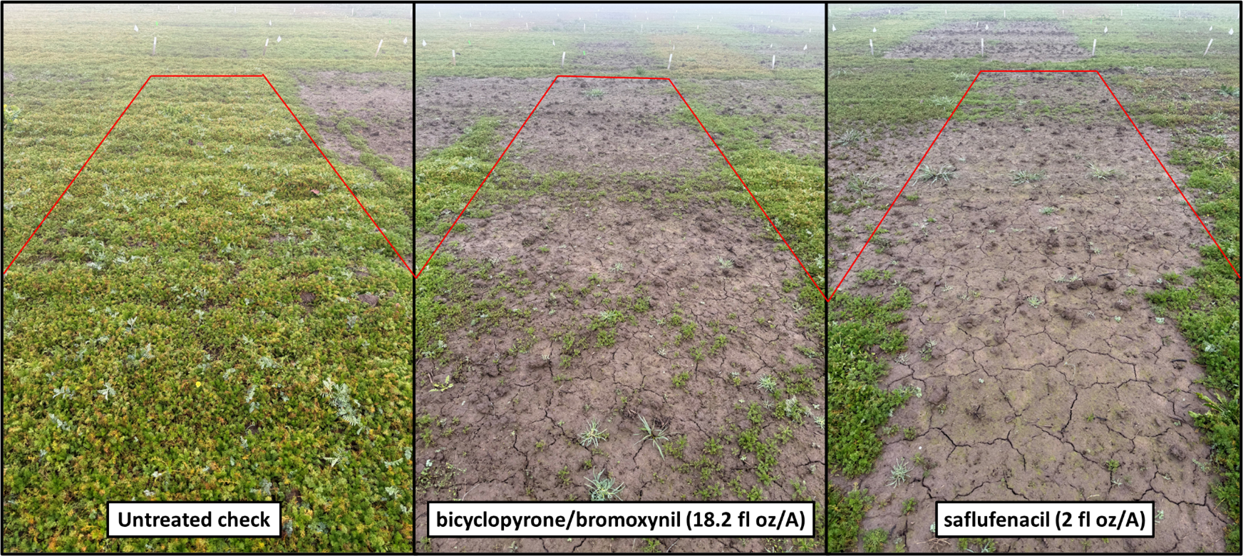Our program is currently evaluating these herbicides in grass seed crops, including perennial ryegrass and tall fescue, targeting a variety of weed species, to identify additional effective management options for growers. Bicyclopyrone/bromoxynil (Talinor), florasulam/fluroxypyr (Starane Flex), and tolpyralate/bromoxynil (Tolvera) are non-labeled products in grass seed crops. These treatments and rates application were for research purposes only.