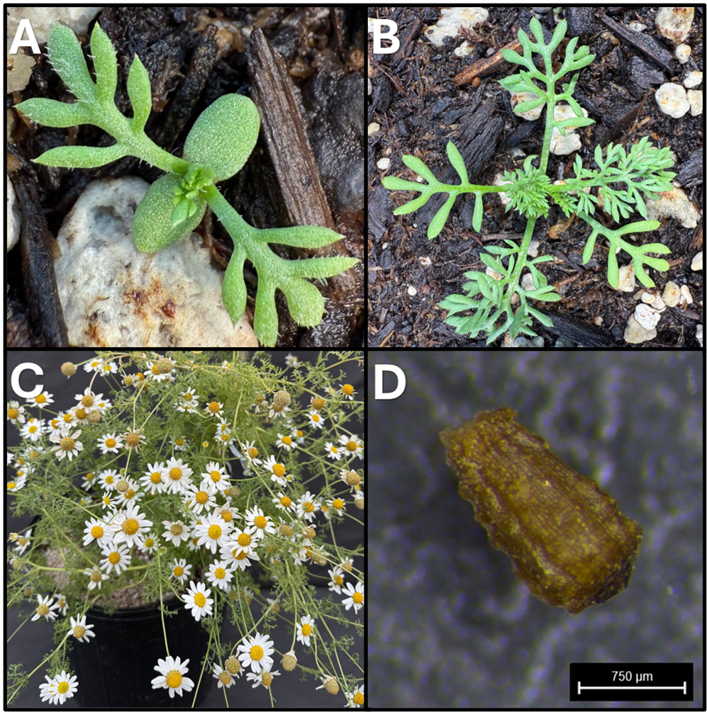 At the seedling stage, cotyledons are about 0.3 inches long with faint veins, and their bases are fused, forming a small fleshy cup (Figure 1A). The first true leaves develop in opposite pairs and are covered with short hairs. As the plant grows, leaves become alternate and are finely divided into narrow leaflets and lobes (Figure 1B).