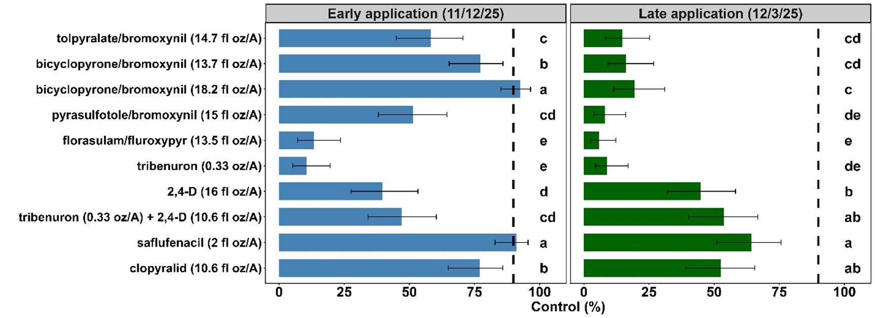 Herbicide performance differed depending on the active ingredient and application timing (Figure 2). Overall, control declined when herbicides were applied later to larger plants. When applied at the early timing, bicyclopyrone/bromoxynil (18.2 fl oz/A) and saflufenacil (2 fl oz/A) provided the highest levels of control, exceeding 90% (Figures 2 and 3). However, bicyclopyrone/bromoxynil applied at the lower rate (13.7 fl oz/A) provided reduced control (72%) compared with the higher rate (92%). In contrast, control was substantially reduced for most treatments when applied at the later timing. Saflufenacil remained the most effective treatment at the late application timing, providing 64% control, followed by tribenuron + 2,4-D (53%) and clopyralid (52%) (Figure 2). Several treatments that performed well at the early timing, including bicyclopyrone/bromoxynil, showed a marked reduction in efficacy when applied to larger plants (Figure 4).